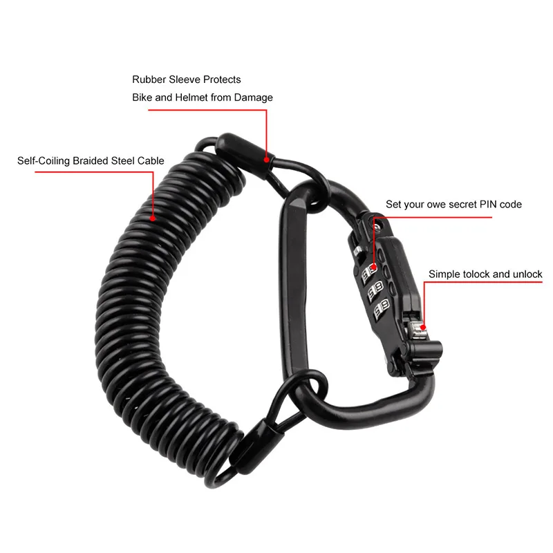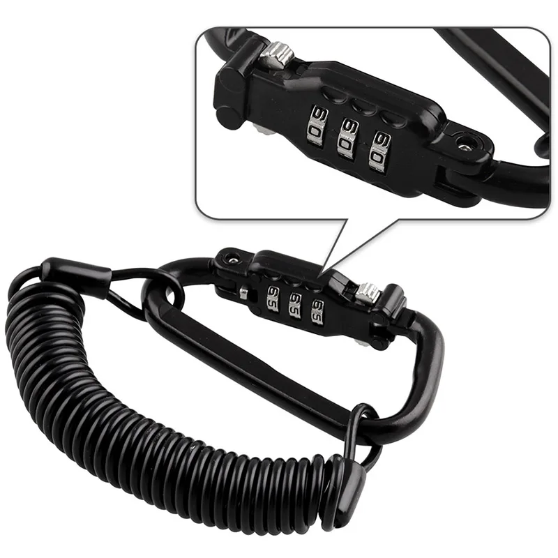 Motorcycle Helmet Lock & Cable. Black Tough Combination PIN Locking Carabiner Device Secures Your M